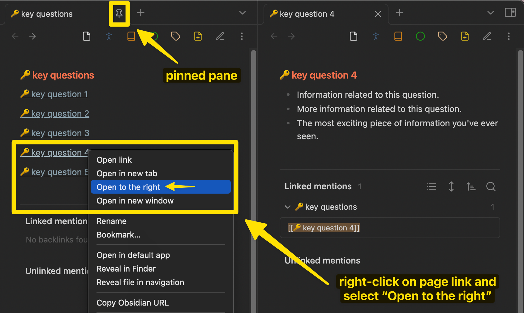 (a) For instance, when reading, watching, or listening to something, you could have open in Obsidian a pinned pane containing links to all your key questions, and then when you come across something you want to add to one of those, you could click on maybe just a link or two to get to the page you want and add the material directly to the page.