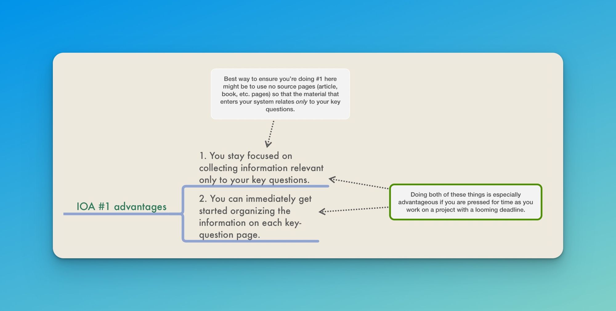 If you have a project deadline you need to meet rather soon (let's say "rather soon" means "sometime in the next 4–6 weeks") and thus need to be laser-focused on answering certain questions and organizing your ideas in order to meet that deadline, IOA #1 might be a good approach to adopt. (What's a "project"? My own projects are usually writing projects, but a project could also involve creating a video, producing a podcast episode, preparing for a presentation, choreographing a dance piece that expresses the movement of ideas in Hegel's Phenomenology of Spirit, etc.)