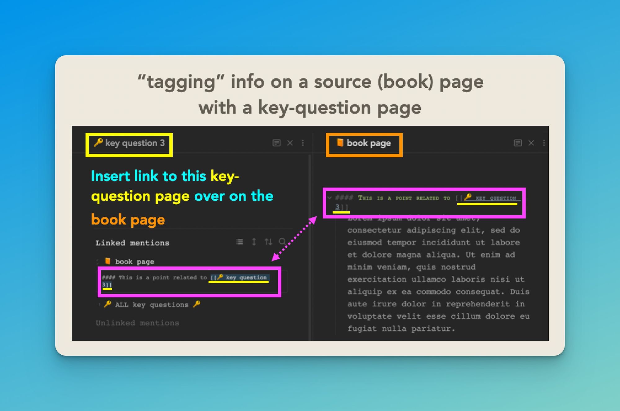 - Of course, contrary to what the image above might suggest, you wouldn't need to have the [[🔑 key question 3]] page open in order to tag material on a source page that's relevant to that key question (even a beginner Obsidian user knows that).